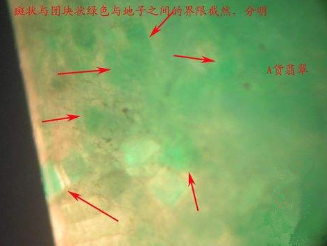 2)对着灯光,在透射光下观察,或在放大镜、显微镜下观察,可以发现颜色不是在硬玉晶体内部分布,而是附在硬玉矿物的外表或是堆积、依附在翡翠的微隙间,常呈网状、团块状分布,没有色根。若将其泡入水中或浸入油中观察,则更加清楚。